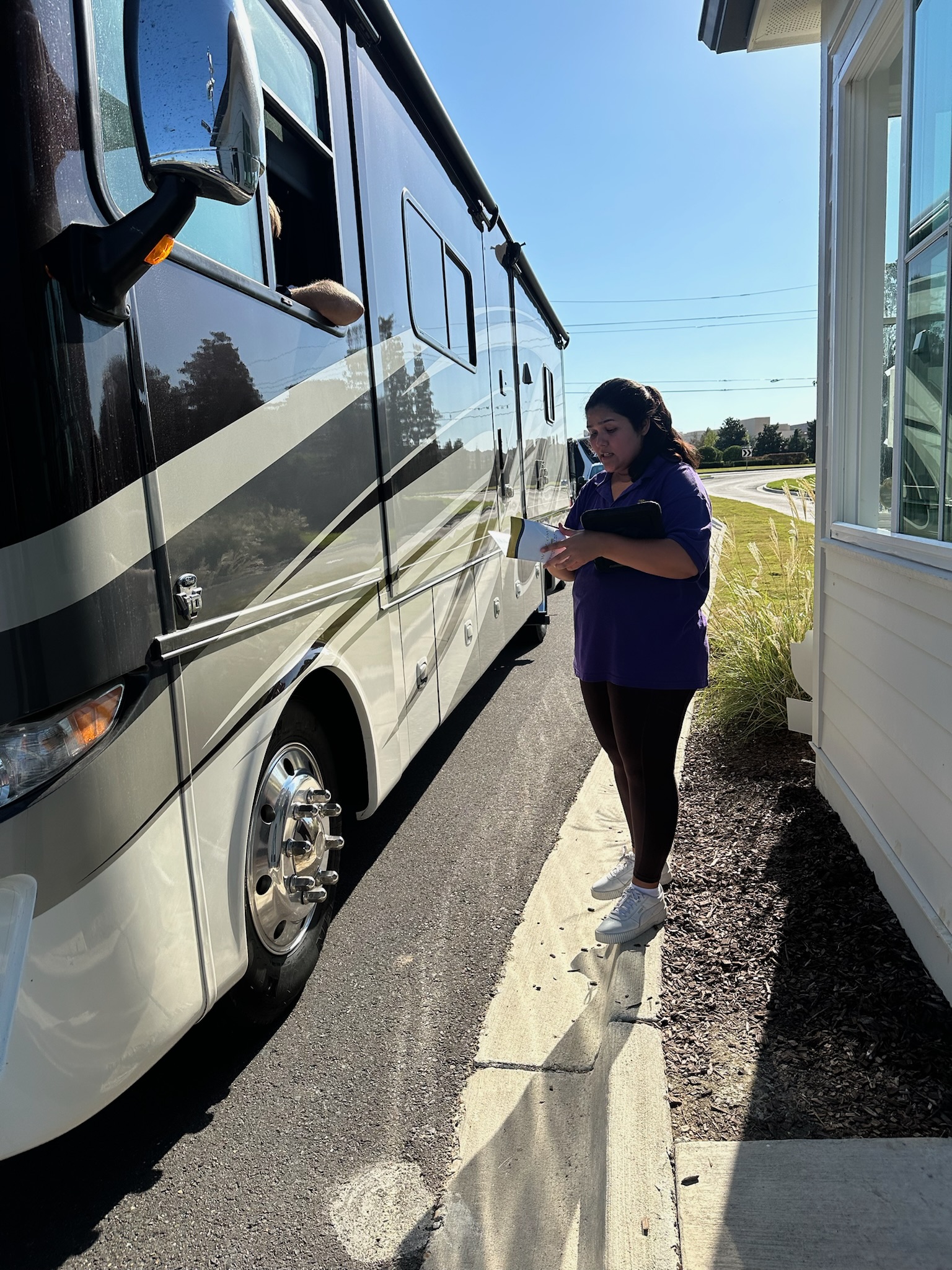 Concrete pull-through sites, vehicle and golf cart parking, patios, picnic tables, fire rings, 30/50-amp electrical service, full hook-ups Please Note: Pets must be on a leash and be cleaned up after. Thank you!
